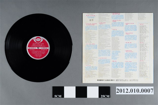 本物件為題名「銀幕上的金曲(1) THE GOLDEN MUSIC OF SCREEN」之唱片封套組,封套設計為彩色印刷,上方為膠捲圖樣,左邊置入出版訊息:朝陽出版社紅色商標,立體聲STEREO、唱片編號TP-5301及「卡帶同時發行」白色字樣;中間有主要中英文題名及「創票房高潮的世界名片動聽主題曲精華」黑字白框之宣傳字樣。主體以唱片A、B面曲目(白底藍字),搭配收錄主題曲之電影片段畫面。封底設計:該唱片收錄曲目介紹說明與歌詞編譯,收錄之電影主題曲包括:「飛越翡翠窩」、「美國舞男」、「礦工的女兒」、「凡夫俗子」、「藍色珊瑚礁」、「歌聲淚痕」、「吾父、吾愛、吾子」、「爵士春秋」、「桂河大橋」、「歸鄉」、「野玫瑰」。右欄內介紹銀幕上的金曲(一)、(二)、(三)收錄曲目。下方為該唱片出版項:朝陽唱片出版社發行;出版登記證:局版台音字第0104號;營業登記證:北市建一商(62)字第80187號;地址:台北市承德路495巷9號;電話:5972034。