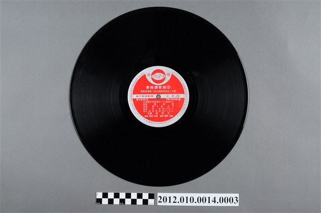 本物件為題名「黃梅調歌劇(2) 梁山伯與祝英台」,33又1/3轉之雙面黑膠唱片。紅白雙色標籤上印刷有朝陽出版社紅色商標、「黃梅調歌劇(2) 」、「電影原聲帶「梁山伯與祝英台」中集」(紅底反白字體)、「STEREO」、「豪華版」以紅字書寫字樣,唱片內容設計以紅底反白字體表現,如:「SIDE 1」、唱片編號「TP-5102-A」、收錄曲目「下山岡」等六首,以及「凌波 樂蒂主演」、「靜婷 凌波主唱」等字樣。出版資訊以繞圓形標籤周圍表現:出版登記證:局版台音字第0104號;營業登記證:北市建一商(62)字第80187號;朝陽唱片出版社發行,地址:台北市承德路495巷9號;電話:5972034。無出版時間。編號TP-5103-A,曲目內容:下山岡、樵夫為誰忙、要摘牡丹上我家等十八相送系列曲目共6首。編號TP-5103-B,曲目內容:求親早到祝家村、兩地相思、訪英台等6首。