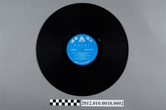 本物件為題名「暢銷音樂47」收錄1979年終迪斯可金榜歌曲之33又1/3轉之雙面黑膠唱片。圓形標籤設計為藍底反白字體單色印刷,上方「鐘聲唱片」商標以及「暢銷音樂47」字樣;中間書寫「STEREO」、唱片編號「CKL-7047-A」字樣。下方為主要曲目、民國69(1980)年1月出版,圍繞圓形標籤為「出版登記証:局版台音字第0047號」以及「33 1/3 RPM」字樣。編號CKL-7047-A,曲目內容:熱物、怪物、對舞等6首。編號CKL-7047-B,曲目內容:天生的活力、老闆、青年會等6首。收錄曲目以1979年西洋流行迪斯可金榜歌曲。