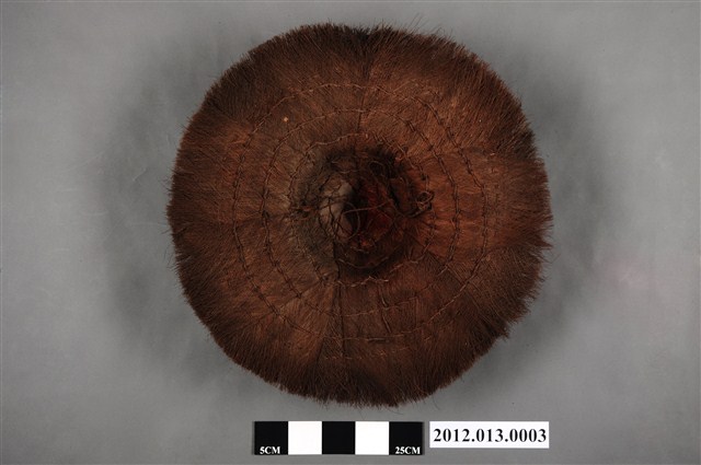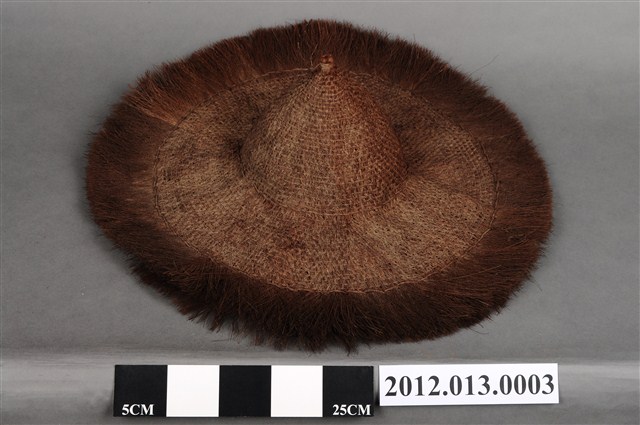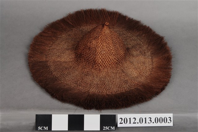 本文物為斗笠,利用草編織而成,邊緣並未修整,斗笠帽中間較尖。其目的為防雨及防曬,編製時需要製作斗笠的木模,通常會利用竹葉為主要製作材料編織而成。