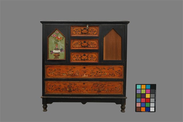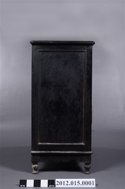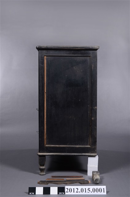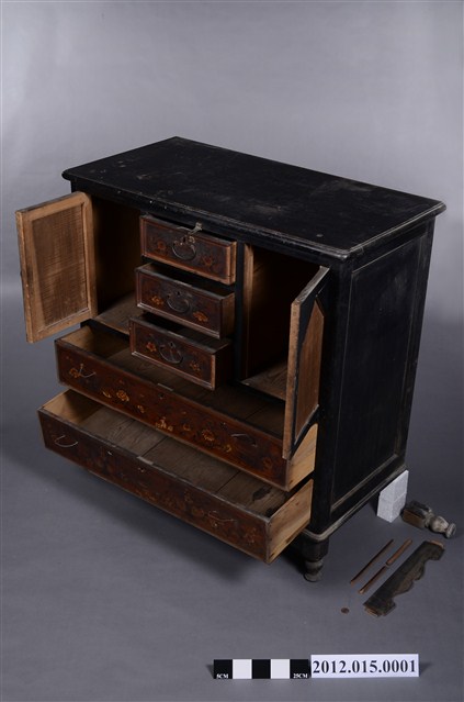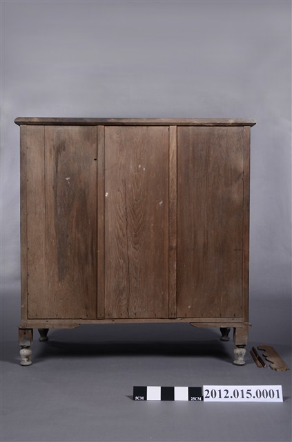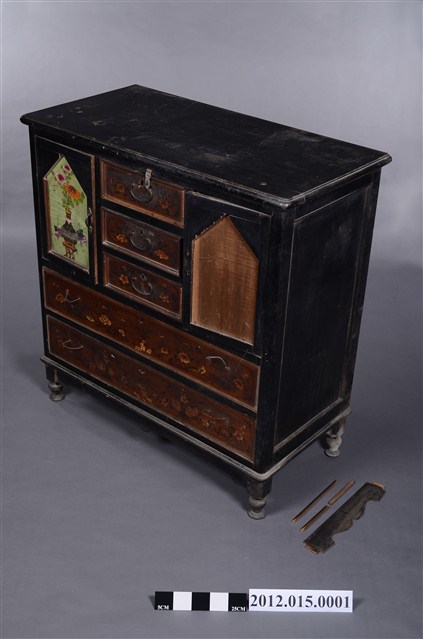 根據捐贈者謝高陞先生描述,本件為其祖父母使用之衣櫃,約與紅眠床同時期或更早。木質櫃體,下層有兩層長抽屜,上層中央為三層小抽屜,左右各一拉格。抽屜面板有墨繪與彩繪傳統漢式花草紋裝飾,中央附有金屬鎖孔及橢圓形屜環。左右拉門鑲嵌彩色玻璃畫,左側玻璃畫以瓶花為繪畫主題,但玻璃已龜裂,右側玻璃畫則已遺失,支腳採圓柱形車枳腳。