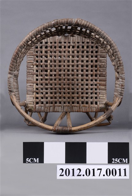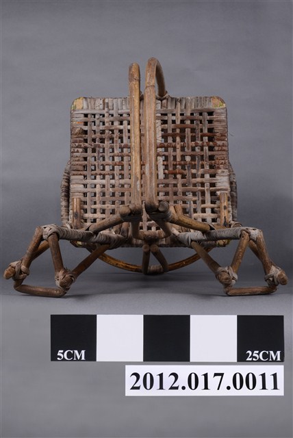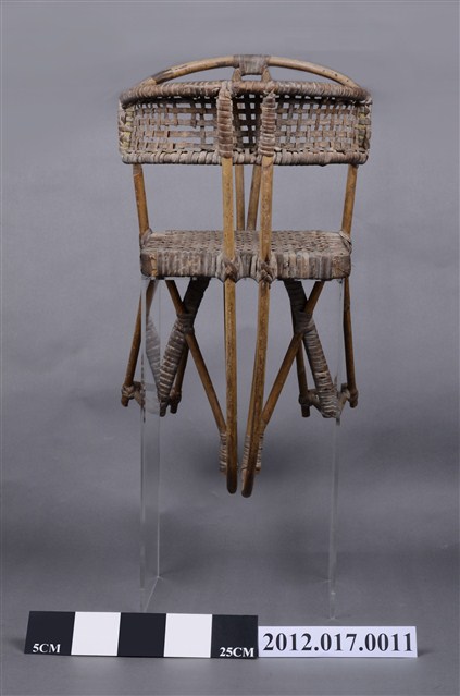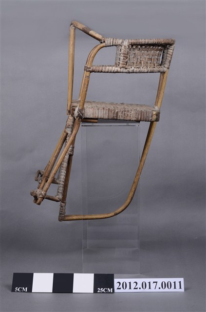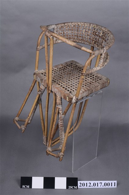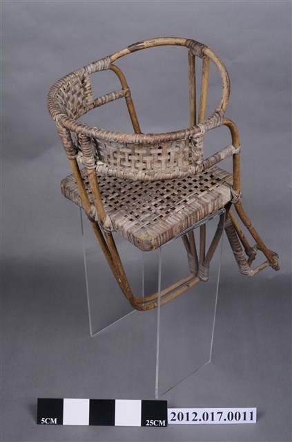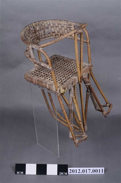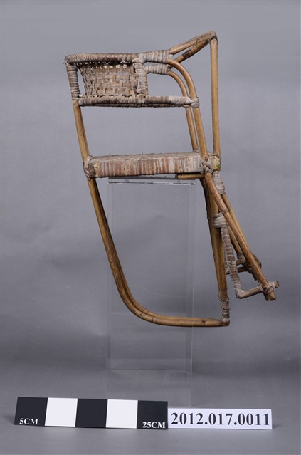 1.載運幼兒用腳踏座椅,骨架為藤質,椅面為竹篾材質,採壓一挑一四角孔編,孔隙頗大,方便透氣,椅面四周以木條為框,竹篾條來回纏繞包覆而成。該座椅椅面上有兩道圈背,最上圈以兩支藤條曲折銜接成橢圓形,作為靠背與手扶之用,手扶部分略為上翹,下圈藤條則為靠背與穩定結構之用,上下圈靠背間有以竹篾壓一挑一四角孔編成的椅背,用以增加舒適度與透氣效果;椅面上部前方為藤條曲彎成180度的構件,除了加強結構,也有分開雙腿功用,椅面下部前方有椅藤條曲彎製成的三角形腳踏構件;椅面後部從圈背處有兩道勾弧形的長藤條;整體接合處以竹篾或鐵釘固定。因年代略為久遠,藤條部分多有損傷刮痕,竹篾的皮面明顯泛白,椅面邊框的四角部分有明顯破損,鐵釘皆已生鏽。