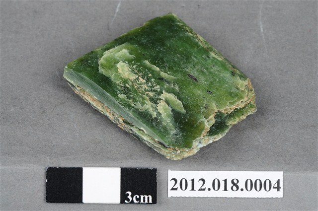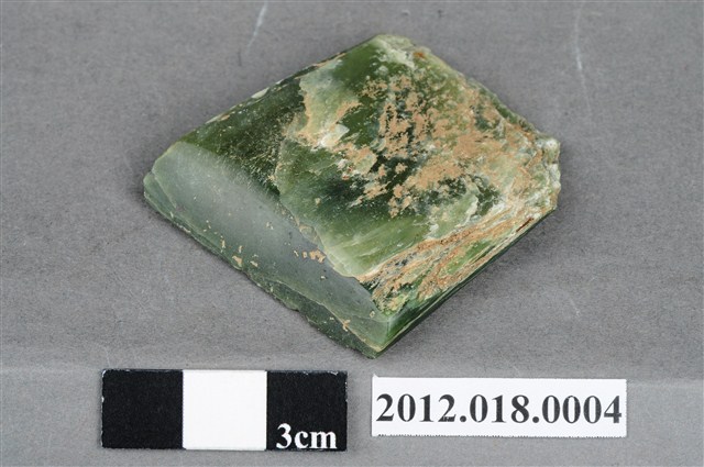 2. 墨綠色小型磨製石錛,臺灣玉材質,外型呈扁薄之正方型,器身通體磨製,四角方轉,背面磨製平直,正面上半柄部殘斷,近底端磨製出長1.0cm之斜面,形成偏鋒刃,刃部大致完好,略有使用消耗。從器身殘斷的狀況判斷,推測為日常生活用之木工工具,非墓葬陪葬品。