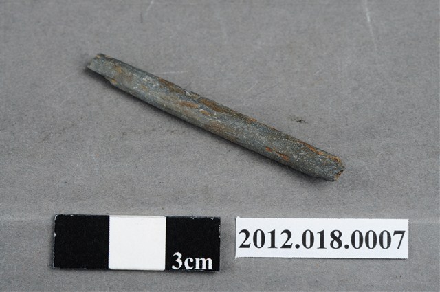 1. 根據潘常武先生描述,本件約於10年前(2001年)左右,於臺東杉原遺址地表採集所得。 2. 黒灰色石針殘件,板岩材質,外型呈細長棒狀,器身通體磨製,斷面呈四方形,本件約石針尾端柄部殘件,尖端與中段斷失,考古學家推測石針為史前人類鑽孔用工具。