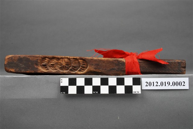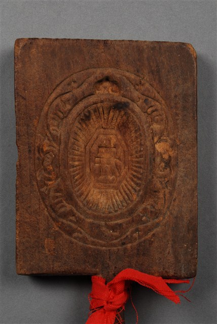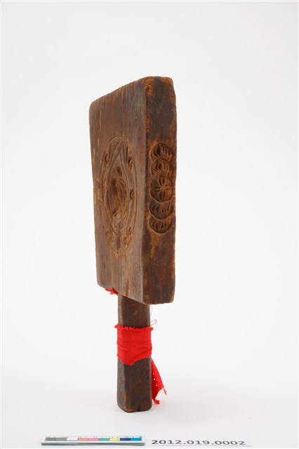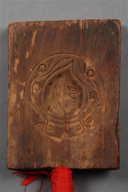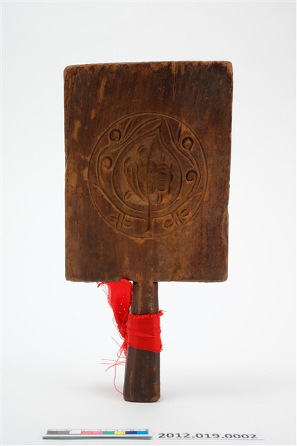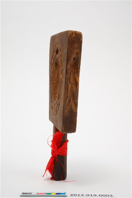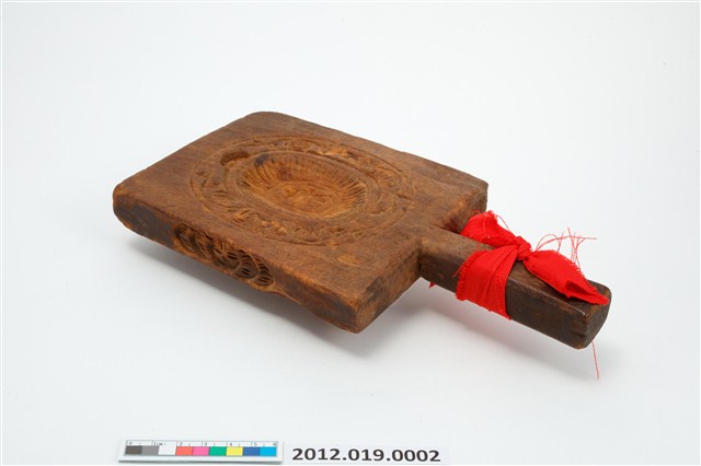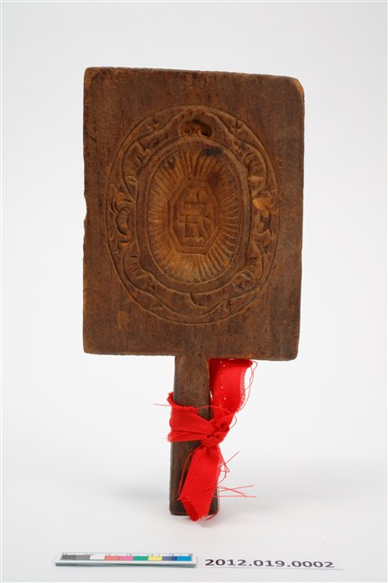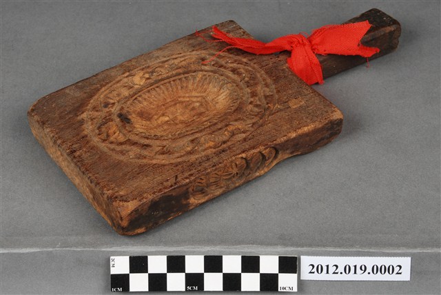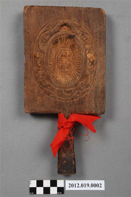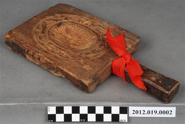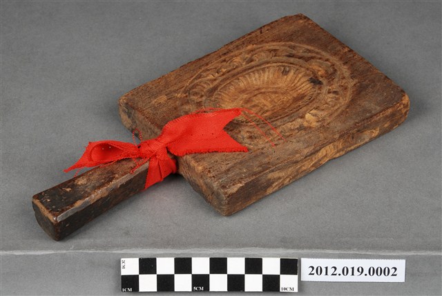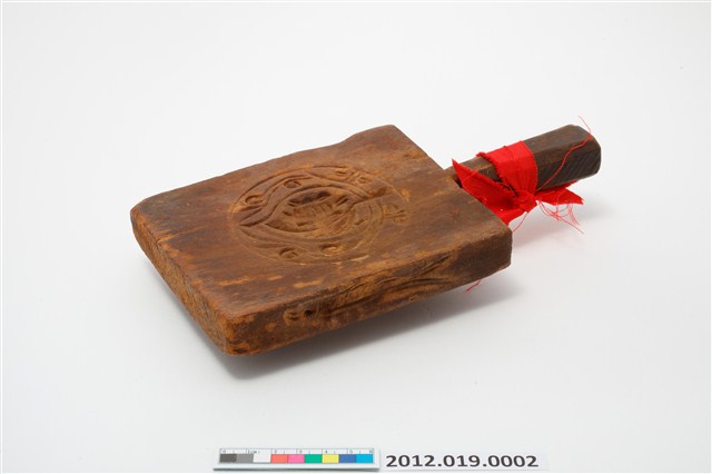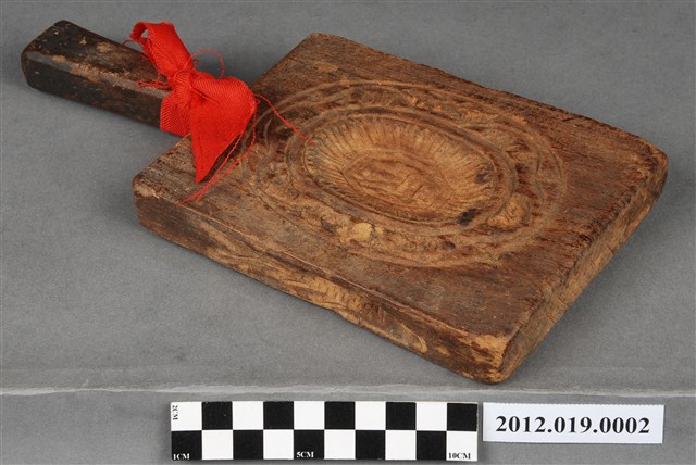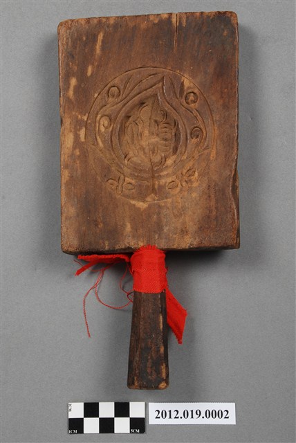 2012.019.0002 長方形四面雕龜桃連錢魚紋帶柄粿印
