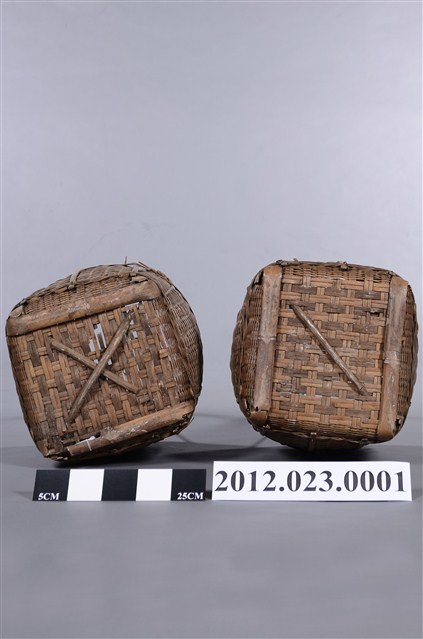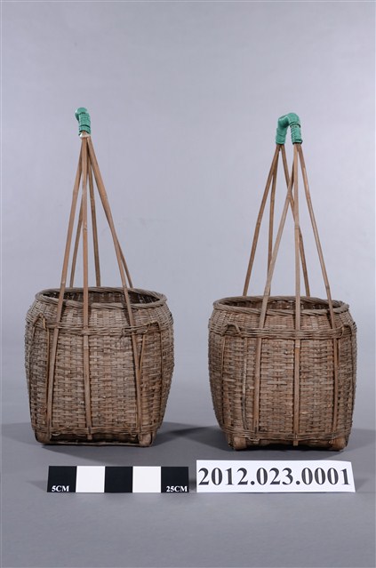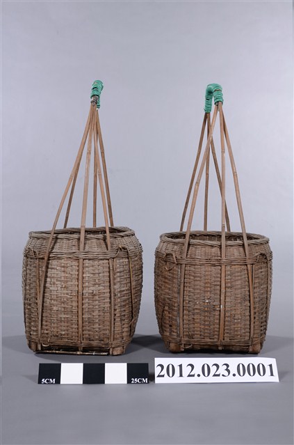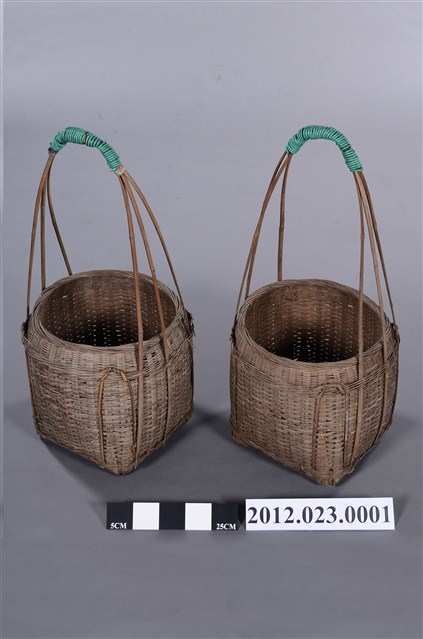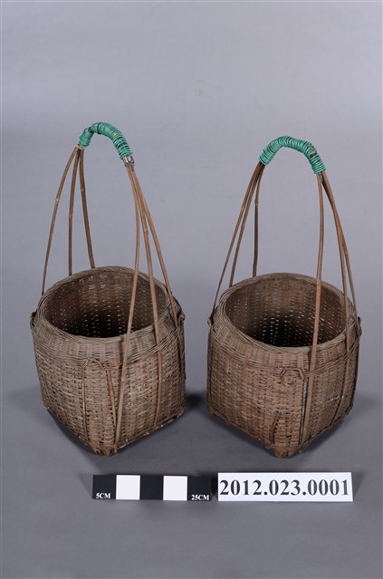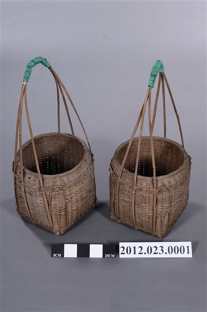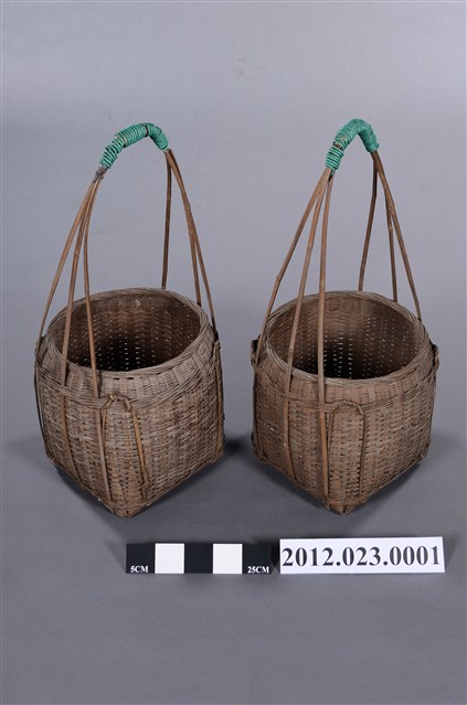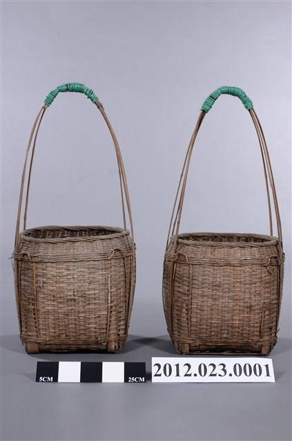 竹編提籃一對2件,形式為圓口、方底,籃體較高,以3股粗竹篾交叉成長提把,可供扁擔提肩挑起,外型上猶如以中小型的「米籮」外加長提把,為裝物的籃子,2件提把處皆以2mm的綠色電線圈綁加固。底部可能受潮過,有竹編裂化情形。 100/10/29-101/03/25期間曾於臺灣工藝研究發展中心「工藝印記-臺灣百年工藝文化特展」展出。