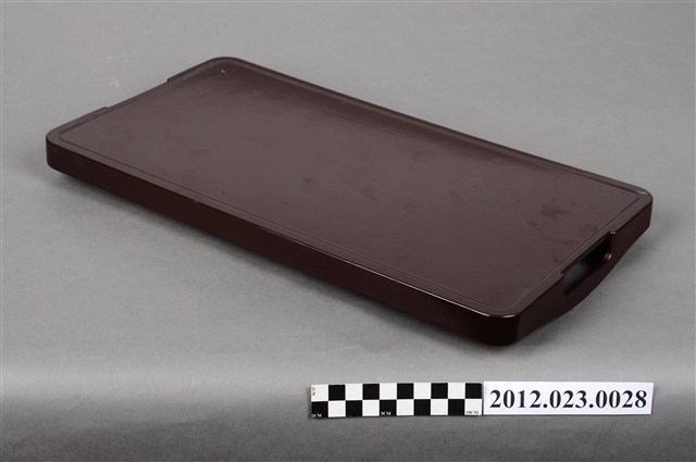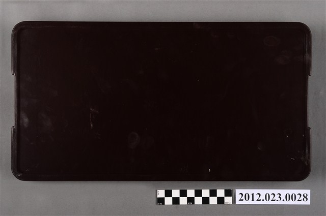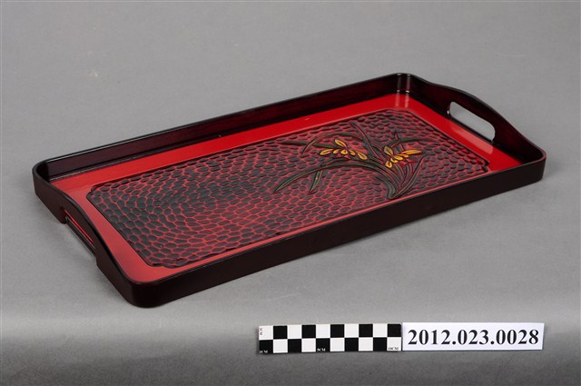 本件漆器,為木胎雕刻蘭花紋方盤,方盤心以手工雕刻出龜甲紋理,上雕一株開花的蘭花,再以紅色與黑色漆交錯,增加立體感,蘭花則上黃漆。右側把手有斷裂情形。為「蓬萊塗」作品。本件與果盒、小碟應為同一批作法,可能為結婚嫁娶或新居落成時所購買。