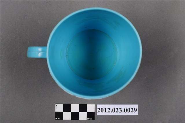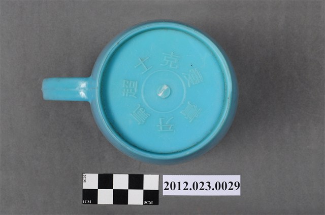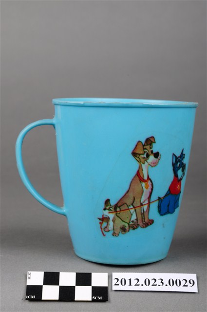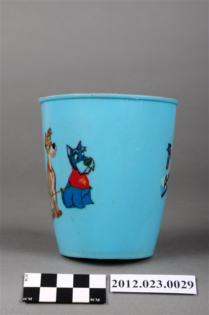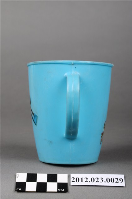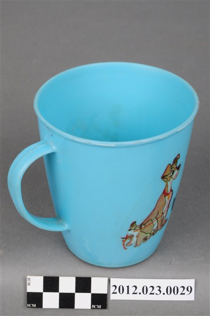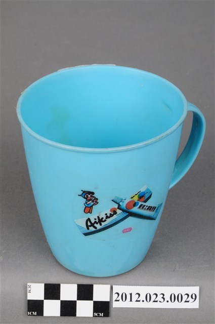 臺南市光南化學工廠生產之塑膠製漱口杯,淺藍色,杯腹印有迪士尼卡通狗的圖案及「愛克士超氟牙膏、Aikiss、KNC」等字,杯底。亦印有「愛克士超氟牙膏」字樣,為戰後初期的物件。光南化學工廠成立民國39(1950)年,最早以化粧品買賣為主,後來才開設工廠生產化粧品及牙膏,其自有品牌「愛克士牙膏」於民國70(1981)年停止生產。