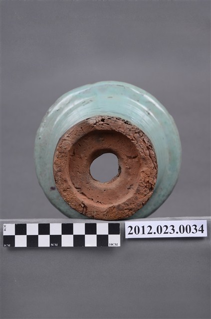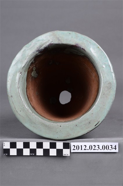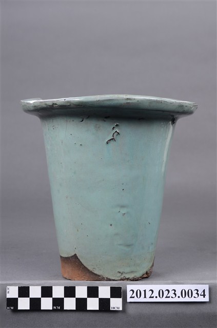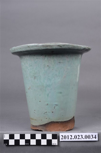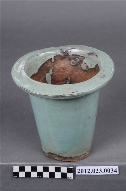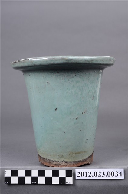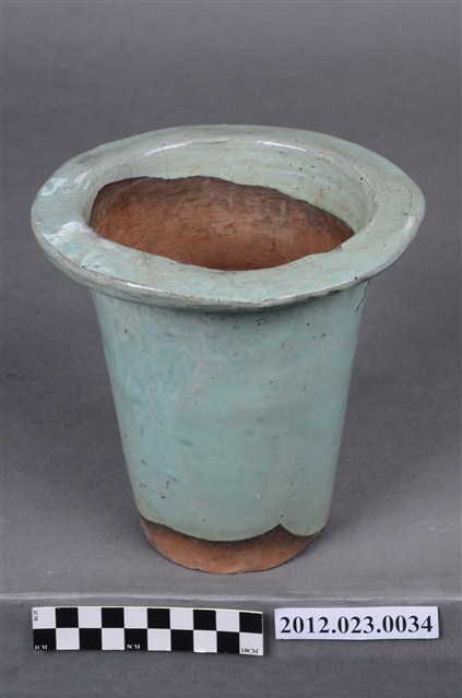 磚胎綠釉花盆,上寬下窄,寬口、口沿外折、長腹、矮圈足,底部內有一個排水孔,表面上有一層綠釉,可能為民國60年代的南投陶物件。