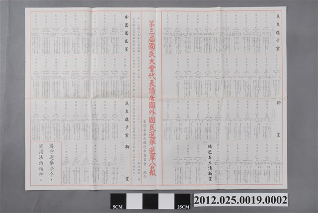 此物件為第3屆國民大會代表全國不分區選舉、第3屆國民大會代表僑居國外國民選舉公報。此次選舉投票日為1996年3月23日,編印單位為臺灣省臺南縣選舉委員會。 國民大會為代議制立法機構,主要職權在於選舉、罷免總統、副總統,以及複決、執行憲法修正案。依據1946年制定的《中華民國憲法》,國民大會為中華民國憲政體制中的最高權力機關。首屆國民大會於1948年3月29日召開,任期6年。在1949年中華民國中央政府遷臺,對於中國大陸各省份已無實質治理能力之背景下,首屆國民大會代表的改選遲遲無法進行,只得透過增補選形式補充員額。解嚴前後,「國會全面改選」成為臺灣民主改革運動的焦點議題,在朝野推動下,透過大法官釋憲及國民大會憲法增修,在1991至1992年間完成了第一屆中央民意代表退職、改選作業。國民大會代表自1991年起定期改選,後因應臺灣社會總統民選之趨勢,經立法院修憲院會通過後,於2005年修憲廢除國民大會。