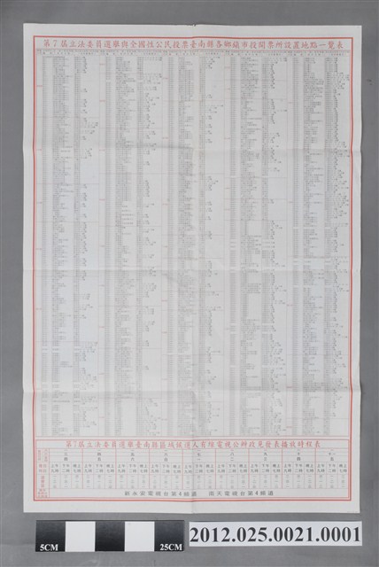 此物件為第7屆立法委員選舉選舉公報(臺南縣第3選舉區),此次選舉的投票日為2008年1月12日,選舉公報編印單位為臺南縣選舉委員會。 1947年,中華民國依據憲法選出首屆中央民意代表(國民大會代表、立法委員、監察委員),但因內戰因素難以實施定期改選。在「動員戡亂時期臨時條款」凍結憲法部分條文的背景下,首屆中央民意代表的任期被持續延長,而有「萬年國會」之譏。為求通達民意,中華民國政府自1972年頒訂「動員戡亂時期自由地區增加中央民意代表名額選舉辦法」,據此定期舉辦「增額中央民意代表選舉」。1991年,隨著「中華民國憲法增修條文10條」的制訂完成,國會改選作業也接續展開,並於1992年底全面改選完畢。立委選制方面,在2008年的第7屆立法委員選舉中,由「複數選區不可讓度制」改為「單一選區兩票制」,任期由3年改為4年。2012年,則修改選務期程,使立法委員與總統選舉一併舉行。