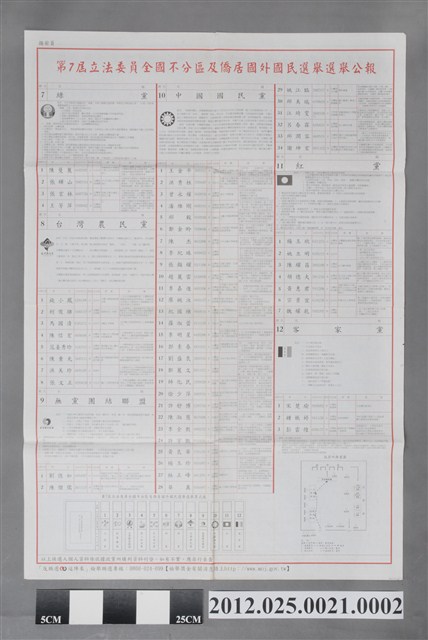 此物件為第7屆立法委員全國不分區及僑居國外國民選舉選舉公報。此次選舉的投票日為2008年1月12日,選舉公報編印單位為臺南縣選舉委員會。 1947年,中華民國依據憲法選出首屆中央民意代表(國民大會代表、立法委員、監察委員),但因內戰因素難以實施定期改選。在「動員戡亂時期臨時條款」凍結憲法部分條文的背景下,首屆中央民意代表的任期被持續延長,而有「萬年國會」之譏。為求通達民意,中華民國政府自1972年頒訂「動員戡亂時期自由地區增加中央民意代表名額選舉辦法」,據此定期舉辦「增額中央民意代表選舉」。1991年,隨著「中華民國憲法增修條文10條」的制訂完成,國會改選作業也接續展開,並於1992年底全面改選完畢。立委選制方面,在2008年的第7屆立法委員選舉中,由「複數選區不可讓度制」改為「單一選區兩票制」,任期由3年改為4年。2012年,則修改選務期程,使立法委員與總統選舉一併舉行。