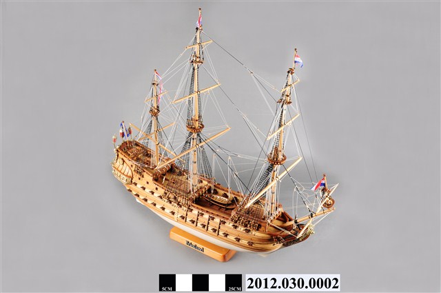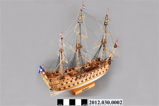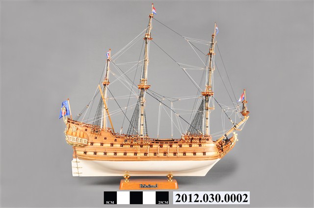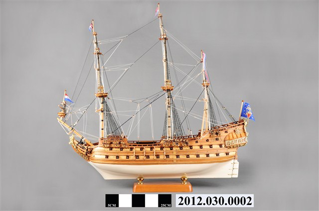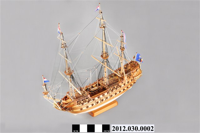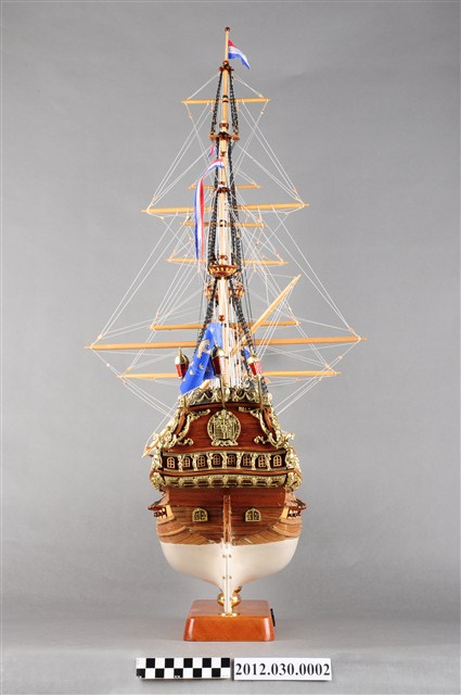 本物件為西元17世紀荷蘭戰船菲士蘭號(Friesland)帆船模型。船設計為3桅,均無帆;主要船身為兩層甲板,船尾增加1層上甲板。船尾懸掛荷蘭國旗。底甲板兩側各配備13口大砲,中甲板兩側各配備12口大砲,上甲板各配置6口大砲。