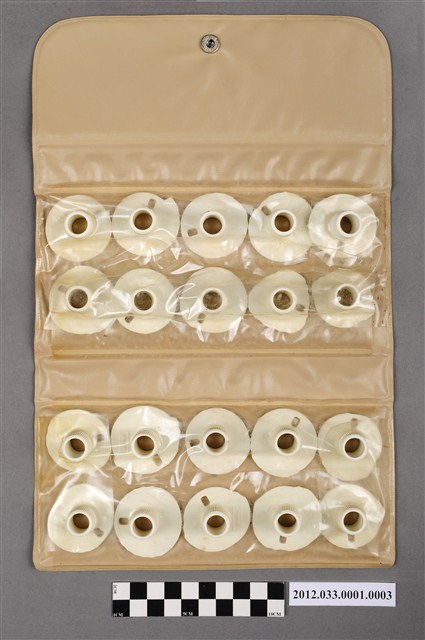 本件為縫紉機原廠所附之白色塑膠線軸蓋,共1包20個,附塑膠包裝袋。使用時可將縫線線軸插入縫紉機上方突起的金屬軸,然後蓋上線軸蓋,使線軸定位,不要因為車縫轉動時跳脫。