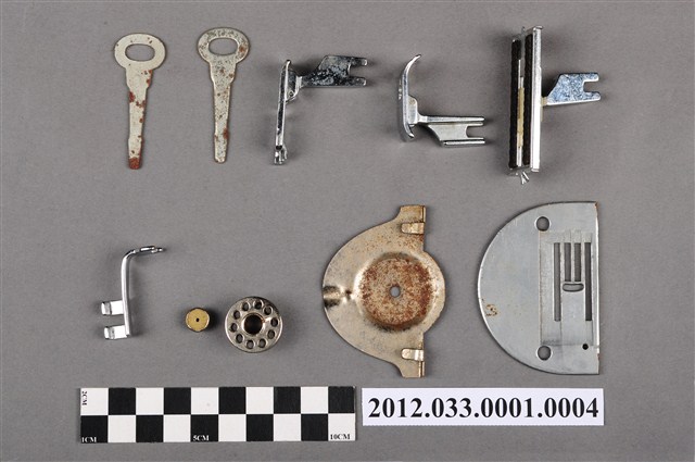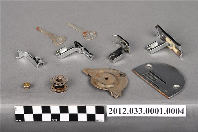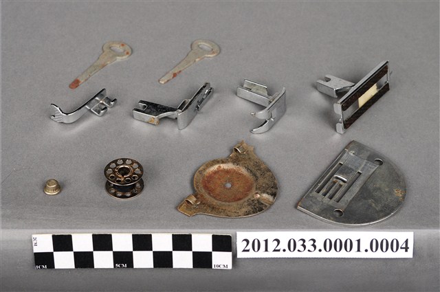 縫紉機原廠所附之半圓形捲線筒蓋板1個,3個不同性狀功能的針頭壓腳。