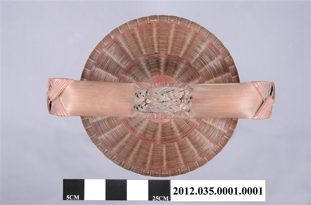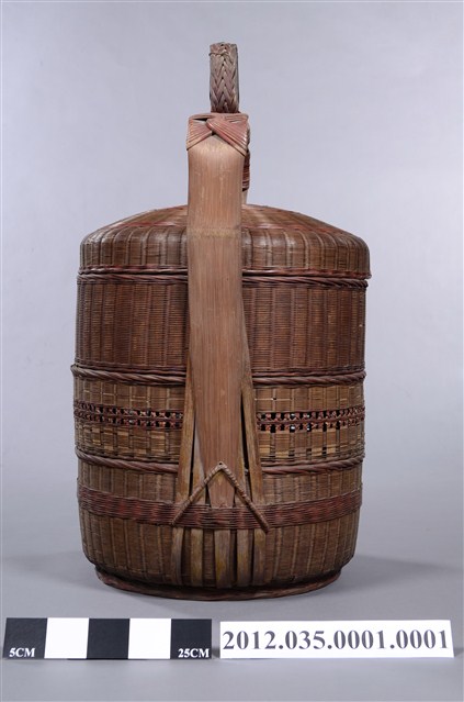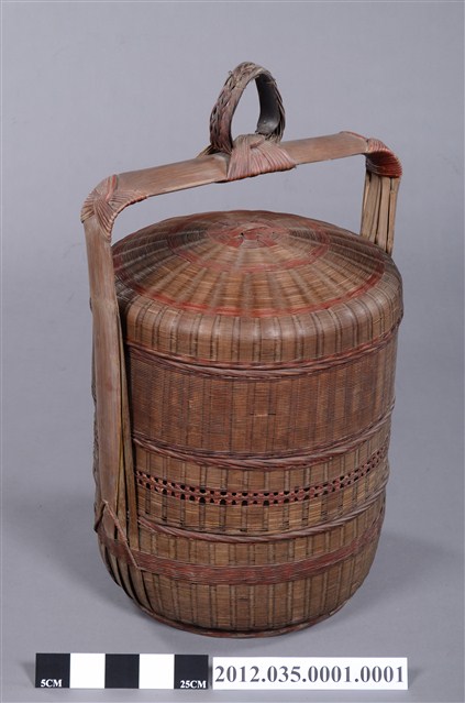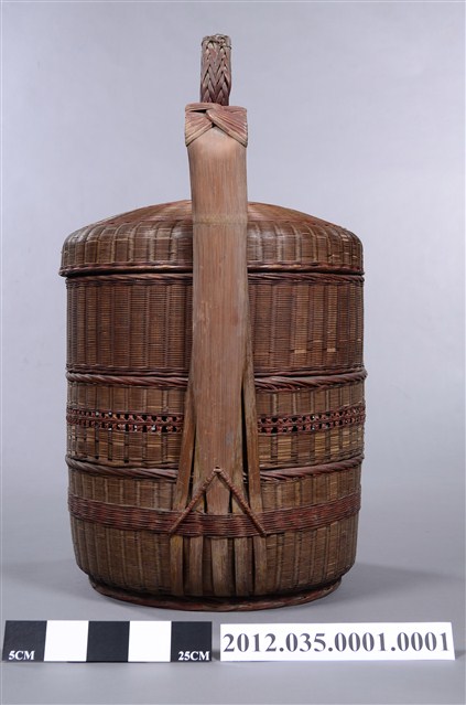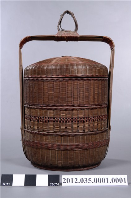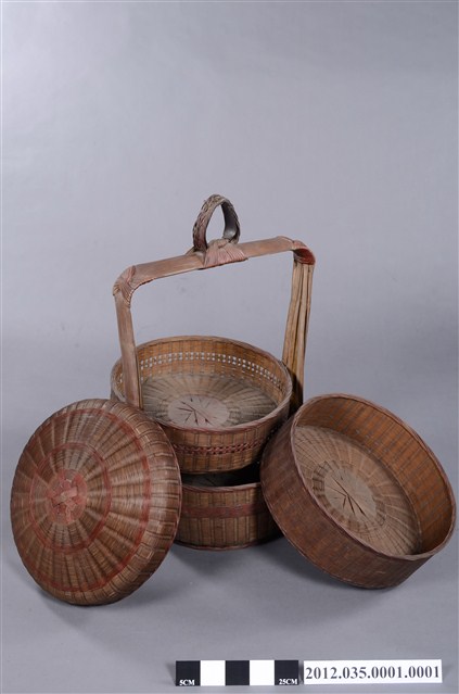 1、本件為嘉義市陳村吉先生(父親陳永,經營天龍製藥廠;祖父陳憨存,經營米店)捐贈的大型三層竹編謝籃之一,此案共有兩件謝籃為一組,併有挑謝籃的竹製扁擔。捐贈人表示該物件在他出生前早由祖父購入,已近80年,該謝籃主要用以挑擔祝壽料理前往親友家。