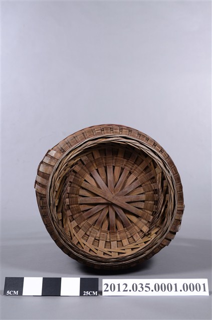 3、各層側邊編法不完全相同,以物件照片由上而下為序,第一層與第三層(底層)相似,惟第三層中另有一道環繞籃周並連結主架構竹片的差異,應有美觀與加固的效用。第二層則另作簍空裝飾,與前二者又不相同。
