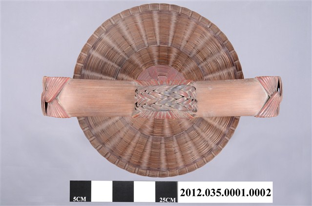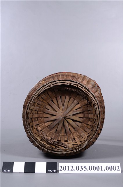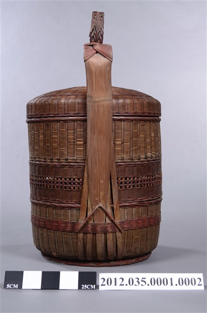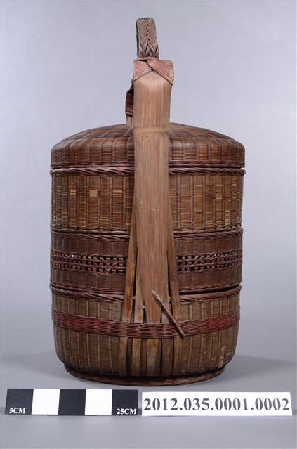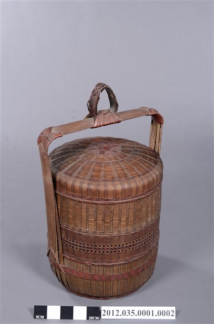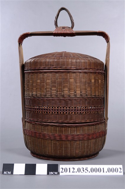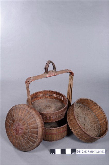 1、本件為嘉義市陳村吉先生(父親陳永,經營天龍製藥廠;祖父陳憨存,經營米店)捐贈的大型三層竹編謝籃之一,此案共有兩件謝籃為一組,併有挑謝籃的竹製扁擔。捐贈人表示該物件在他出生前早由祖父購入,已近80年,該謝籃主要用以挑擔祝壽料理前往親友家。
