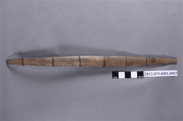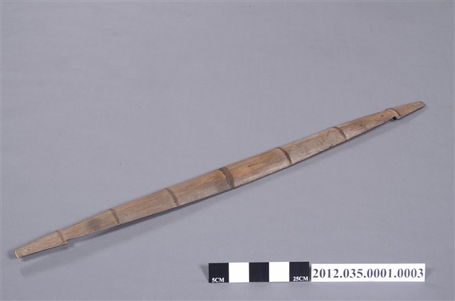 1、本件為嘉義市陳村吉先生捐贈的竹製扁擔,此案另有兩件謝籃為一組,扁擔及為挑送謝籃之用。捐贈人表示謝籃主要用以挑擔祝壽料理前往親友家。 2、扁擔為一般生活用品,挑送各種物件。本件中間寬度8.5公分,兩側漸窄,最窄處寬度3公分。
