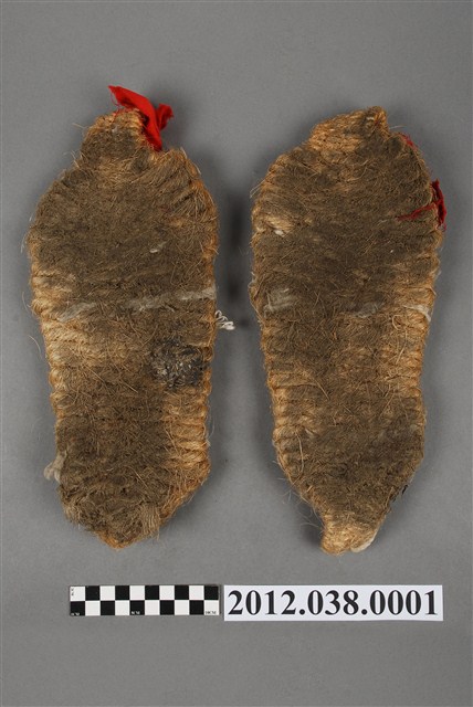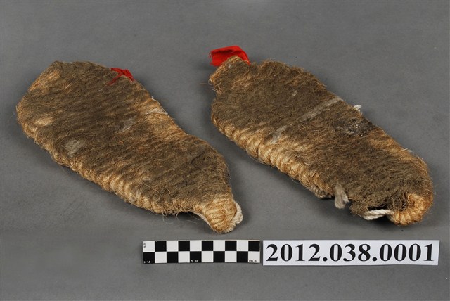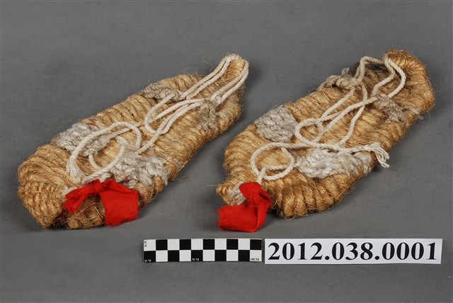 這雙草鞋係由捐贈者施榮泰先生的父親施清源先生所編造,以恆春所產瓊麻為材,質地細緻強韌;其所編製草鞋僅供西勢仔宋江陣出陣排練表演時使用,不另作販售;本件草鞋前後緣突出墊片,用以減緩穿著者腳跟與地面摩擦所造成的傷害,有其製作上的巧思。草鞋前方綁一段紅布,一來用以彰顯喜慶氛圍;二來可與喪事所著草鞋用以區隔,有其民俗意涵的考量。