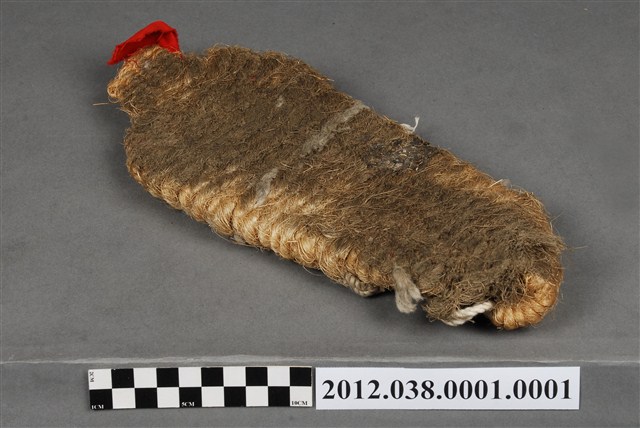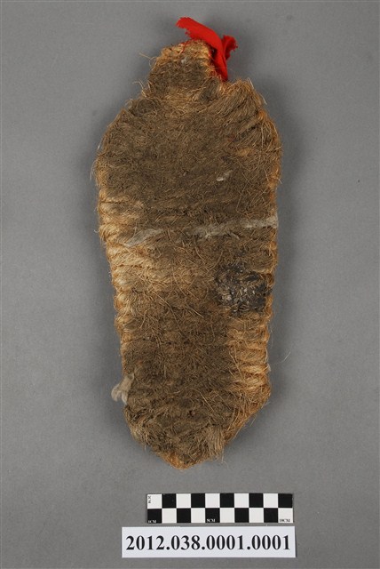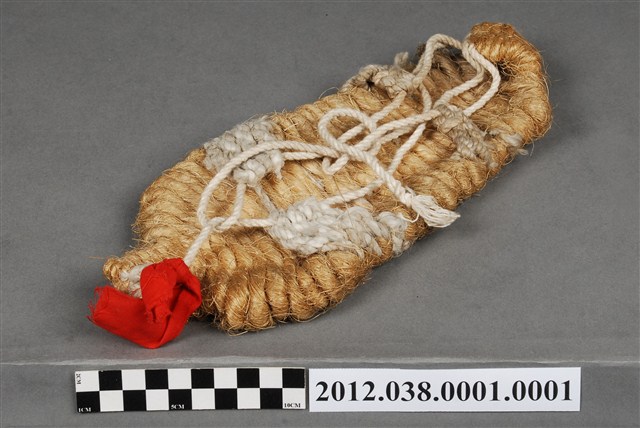 這雙草鞋係由捐贈者施榮泰先生的父親施清源先生所編造,以恆春所產瓊麻為材,質地細緻強韌;其所編製草鞋僅供西勢仔宋江陣出陣排練表演時使用,不另作販售;本件草鞋前後緣突出墊片,用以減緩穿著者腳跟與地面摩擦所造成的傷害,有其製作上的巧思。草鞋前方綁一段紅布,一來用以彰顯喜慶氛圍;二來可與喪事所著草鞋用以區隔,有其民俗意涵的考量。