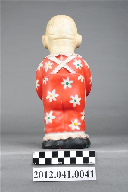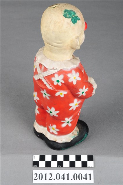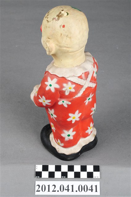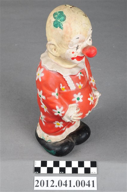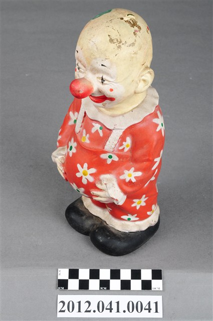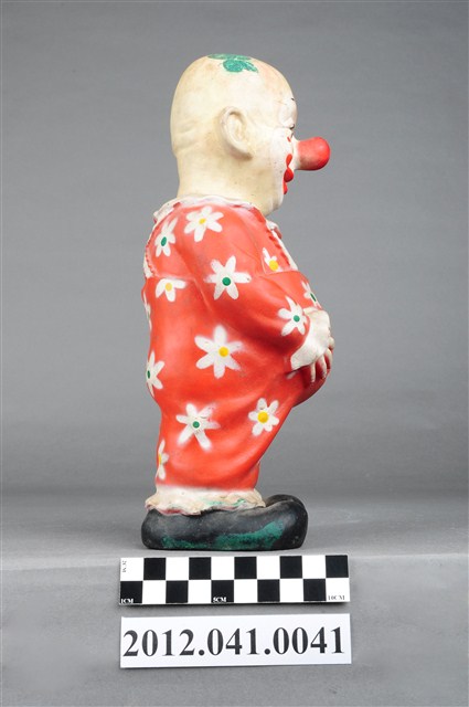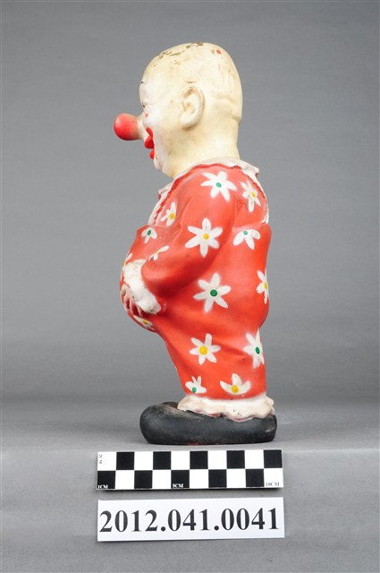 本物件為橡膠製小丑玩偶,雙手摸肚子呈站姿,小丑為光頭,臉塗白有紅色圓形鼻子與嘴巴,其身著白色印花之紅色連身衣,腳穿黑色鞋履。玩偶底部刻有「授權在案 仿者必究」、「弘達公司出品」等字樣。