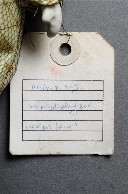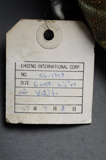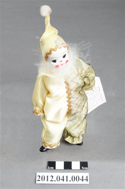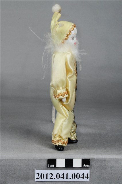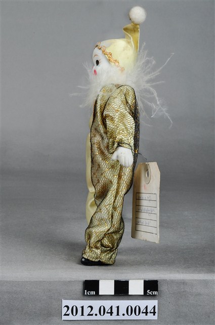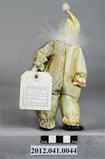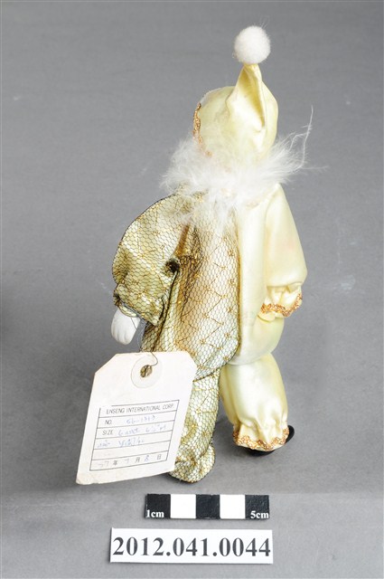 本物件為鵝黃色小丑玩偶,頭戴鵝黃色小丑帽,臉頰有紅色圓形腮紅,身著鵝黃色網紗拼接綢緞之連身衣,腳穿黑色皮鞋。左手掛有製造卡,上面印有「ENSENG INTERNATIONAL CORP.」、「NO.56-1313」、「SIZE」、「77年7月8日」等字樣。