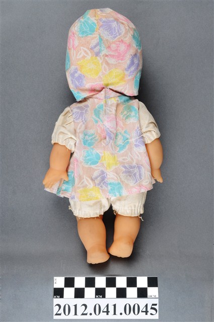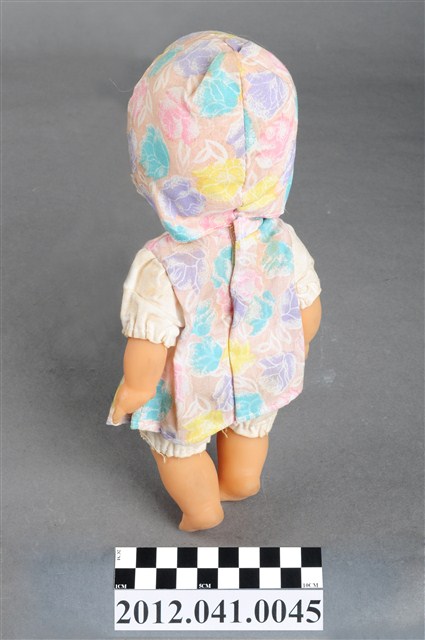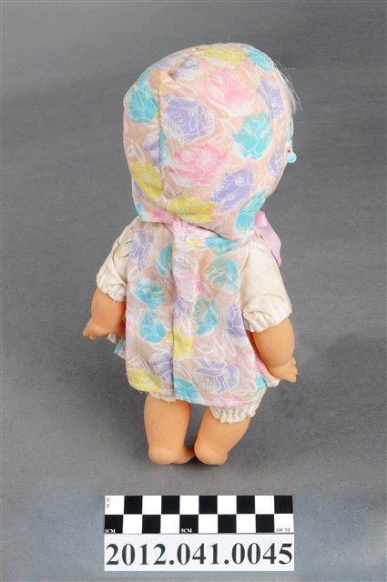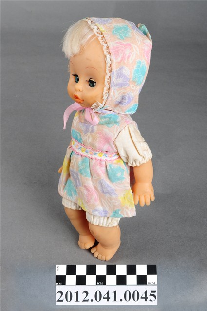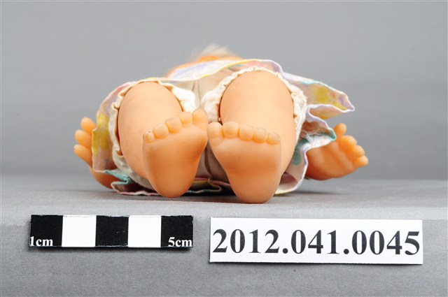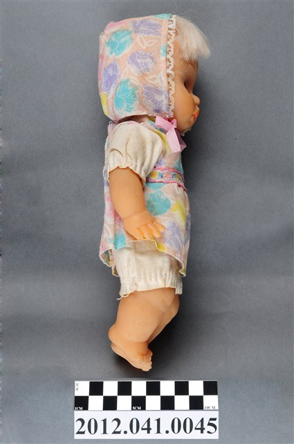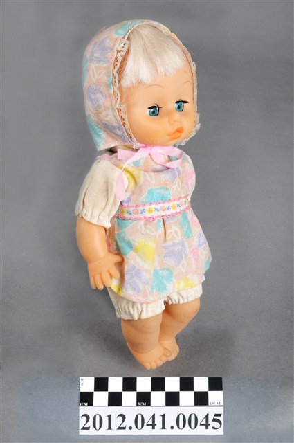 本物件為碎花洋裝小嬰兒玩偶,女孩為白金色頭髮,臉呈眨眼與噘嘴,其身著連帽紅、綠、藍、紫色印花之粉色裙裝與白色短褲,眼睛可以自由調整張眼及閉眼。