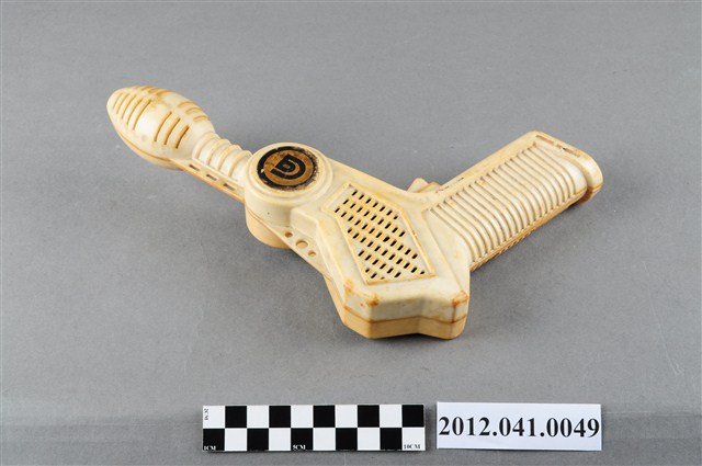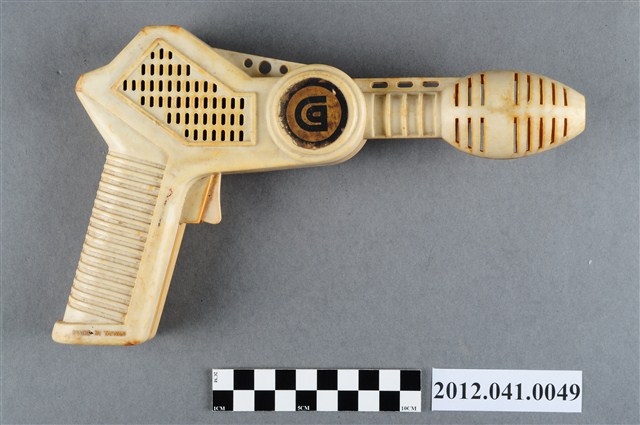 1.本物件為玩具雷射槍,為參照電影《星際大戰》中出現的武器「銀河之槍」所製作的玩具槍。整體已泛黃,最前端槍口膨大,槍身上有黑色貼紙,上面印有英文字「GALAXY GUN II」,底下為數字「2001」,上方為箭頭形狀的圖案,中央原有黑色轉盤,已損壞,另一面槍身中央有一形似字母「G」的圖案,握把最下方有一行英文字「MADE IN TAIWAN」。為捐贈者小時候父親贈送的玩具,約為民國60年左右,作為當時流行玩具形式的見證。