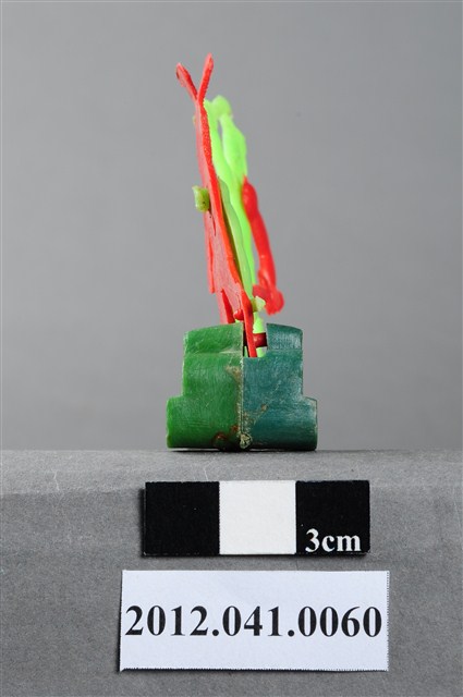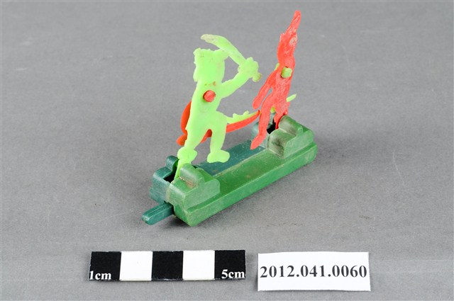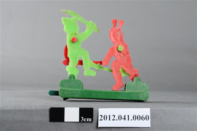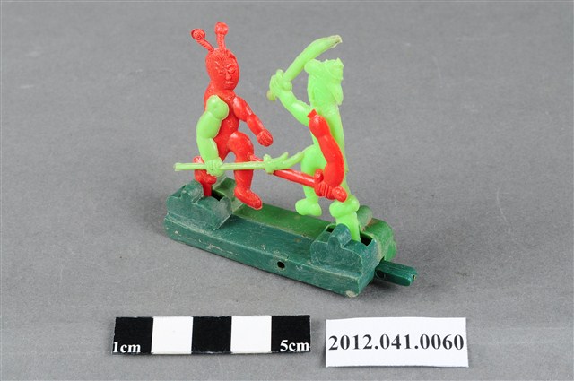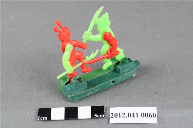 本物件為可動式仿打仗士兵玩具,塑膠材質。該物件外觀為2枚人物站立於同一個平臺,正持刀劍揮向對方的塑膠玩具。物件左方人物為紅色,手臂及武器的部分為綠色。物件右方人物為綠色,手臂及武器的部分為紅色。2枚人物共同站立於1個墨綠色的平臺上。