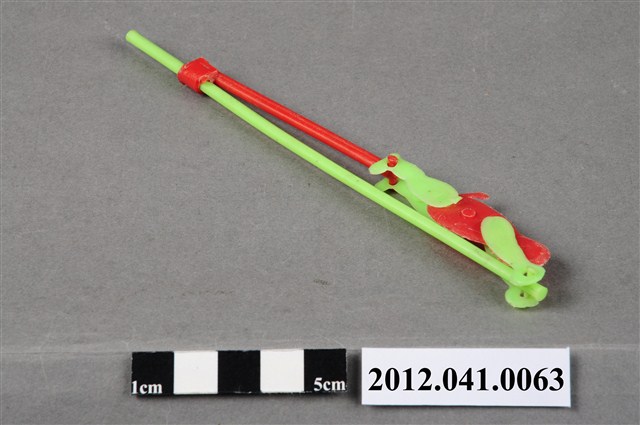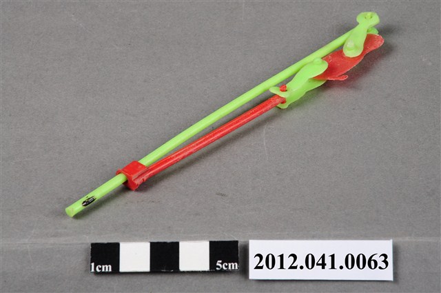 本物件為可動式爬竿運動員玩具,塑膠材質。該物件外觀顏色紅色及綠色,攀爬者的身體及下方固定短竿為紅色、物件主竿、攀爬者的手部與腳部為綠色。攀爬者雙手固定於主竿最上方,雙腳則以短竿與主竿連結。