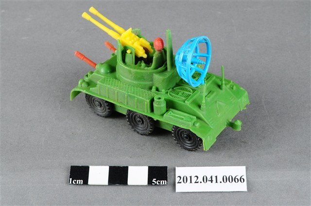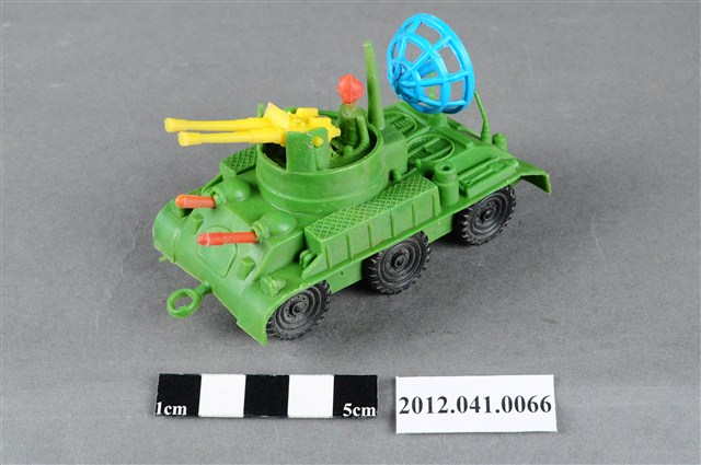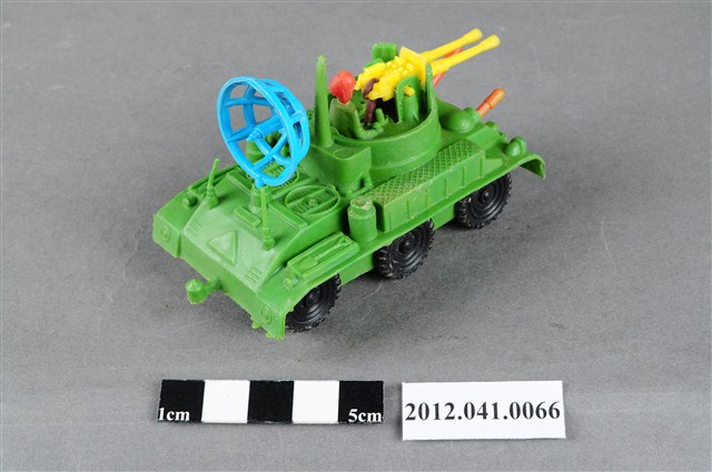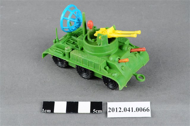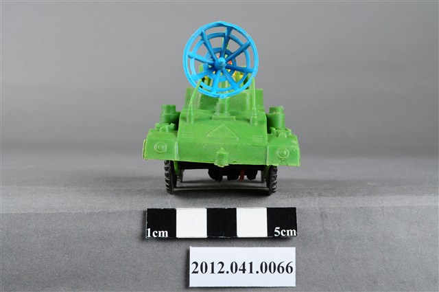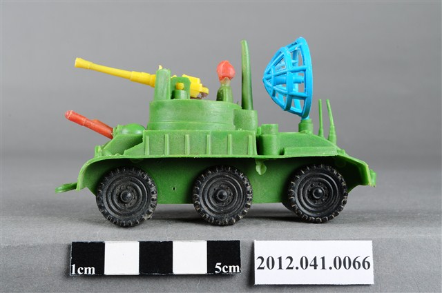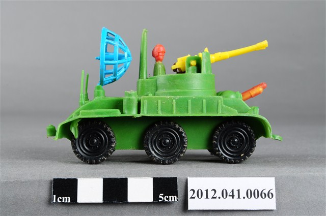 1.本物件為裝甲偵查車造型玩具,車子主體為綠色,有其他不同的零件不同顏色,機關槍部分為黃色,操作零件為咖啡色,有軍人在操作機關槍,此人的頭部為橘色,下半部為綠色。在偵查車的右邊有一藍色的雷達,以及左邊有兩個橘色槍口的槍。輪子為黑色,車子的最左側及最右側都有機關,應為連結前後玩具車的機關。此為捐贈者小時候父親贈送的玩具,約為民國60年左右,可作為當時流行玩具形式的見證。