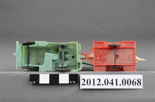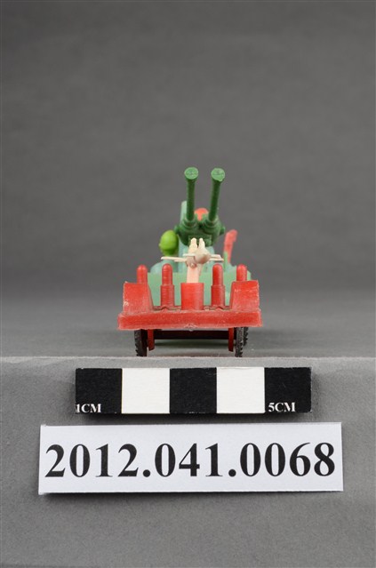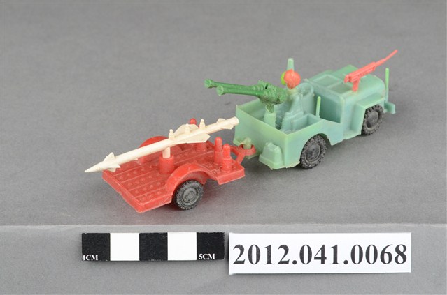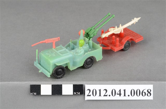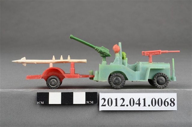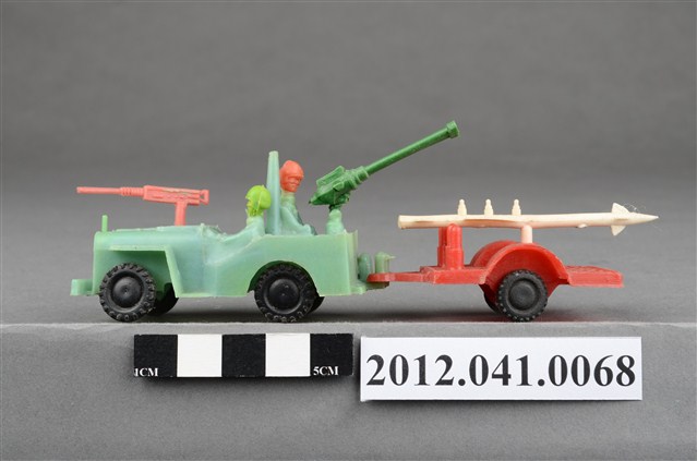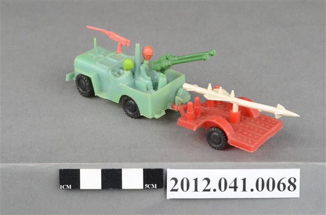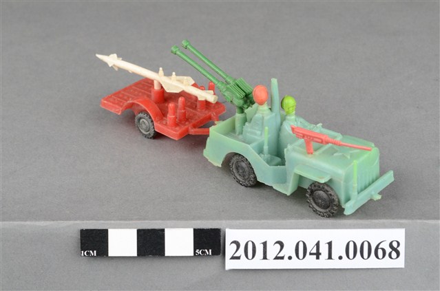 1.本物件由兩種不同車款組成而成,但都是軍方用車。左邊這臺是軍用卡車(指揮車),主體為綠色,前方機關槍與後方軍人的頭部皆為紅色,但前方軍人與後方槍口為綠色,輪子為黑色;後方連結車則為紅色,飛彈部分為白色,引擎蓋上有一顆星星。此為捐贈者小時候父親贈送的玩具,約為民國60年左右,可作為當時流行玩具形式的見證。