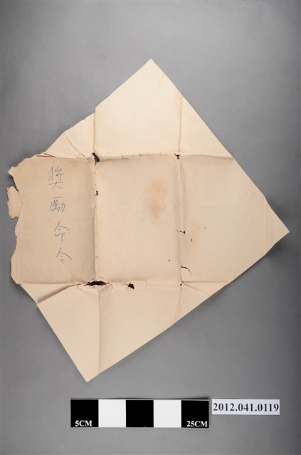 本件應為捐贈者父親(羅賢榮)持有的公文封套;封面手寫「獎勵命令」。