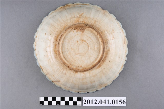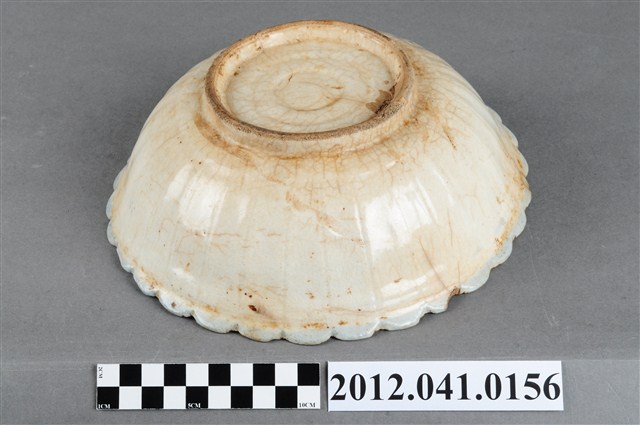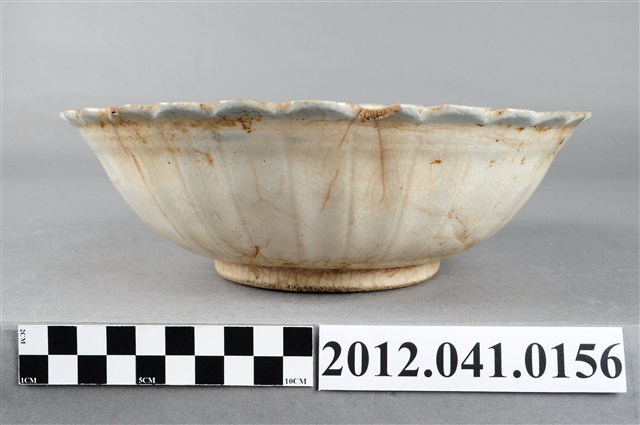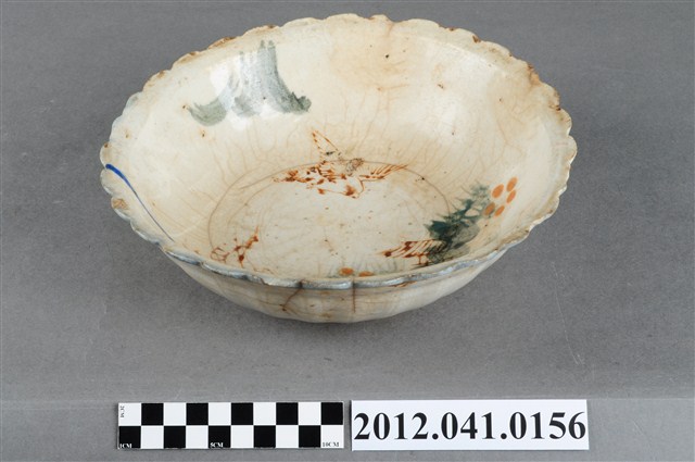 1.這件彩繪山水紋花口碗,屬北投地區產製的日用陶瓷器皿。折沿花口,弧壁,近底部下收,寬圈足。通體施釉,以白釉為底,口沿裝飾青花弦紋一圈,釉面多褐斑,器身及底部並有些許裂痕。外壁沿花口向下壓印豎直長紋作裝飾,碗內則彩繪山水圖案,首先以紅褐釉蓋印出鳥禽與屋舍圖案,再使用大筆青花於碗內壁繪幾筆線條作海景,以墨綠釉點繪樹林、及遠山,樹林處則以橘紅釉點繪五瓣小花作點綴。遠山特別繪出錐狀山形與白雪覆蓋的樣子,為日本富士山的形貌,可見北投窯彩繪圖案與日本的傳承關係。2.日人進入北投經營窯業,也將日本時常使用的陶畫題材