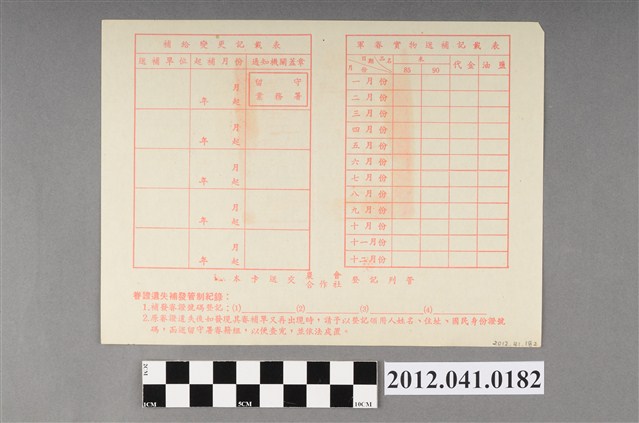 1.本件為「民國70年代退伍軍人眷屬實物補給登記空白卡片」,為捐贈者之父親羅賢榮於民國70年代持有的退伍軍人眷屬實物補給登記卡片。橫式橫書,雙面,皆為表格,保存完整,上有關防印痕,但卡片內容未填寫。當時以口(大口、中口、小口)進行登記。根據〈臺灣省公教員工生活必需品配給辦法〉實施,此法於民國 52年8月27日公布,期間歷經10次修正,於民國 87年10月9日廢止。2.依據民國78年11月25日最後的修正內容,第16條實物配量除員工本人外,其親屬配量以大口、中口、小口區分之。十一歲以上為大口,六歲至十歲為中口,五歲以下為小口,其定量依第17條規定,配給實物之食米,由臺灣省糧食局按月負責供應,並公布其品質、標準、規格。食米標準應由供應單位先行檢驗,並於包裝上標明合格之標簽或證明,每月所需供應食米數量,應事先運儲充足。食米之配發,按本人九公斤、親屬大口九公斤、中口五公斤、小口二.五公斤之數量配給,餘額配量自由擇領實物或折發代金。配給實物之食油、食鹽、液化石油氣折發代金。
