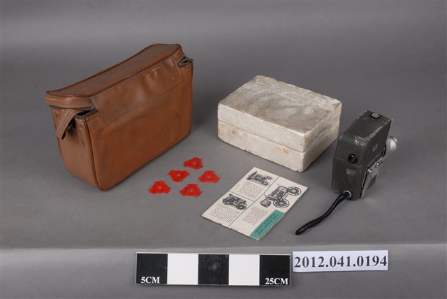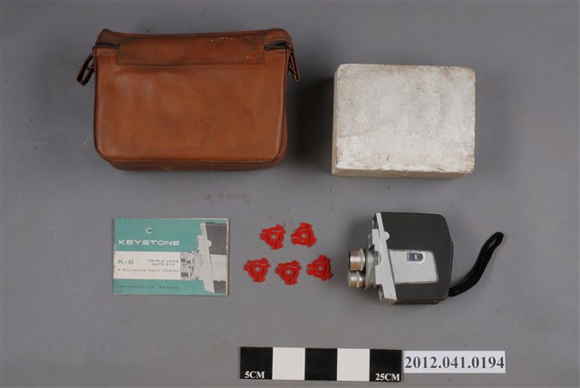 本物件為一組八釐米電影寫真機,共有1個保護皮套、1臺寫真機、1本說明書。皮套外觀為咖啡色的長方皮包,整體外觀有使用痕跡,物件上方為拉鍊設計,由正面可見設置1個前置夾層,該夾層中間設有1個轉紐鈕扣。皮套兩側縫製1道背帶。寫真機外觀整體為灰色。由正面可見「K-6」、「auto eye」的字樣,物件背面可見繫有1條黑色尼龍繩。由物件的一側可見「KEYSTONE」、「automatic eye」、「UNEXPOSED」字樣。說明書外觀為藍綠色。該說明書封面可見「KEYSTONE」、「K-6」、「TRIPLE LENS AUTO EYE」、「8 MILLIMETER MOVIE CAMERA」、「INSTRUCTION MANUAL」字樣。
