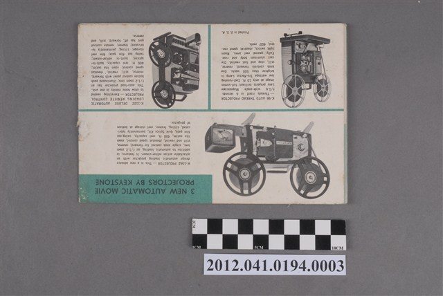 本物件為八釐米電影寫真機說明書,外觀為藍綠色。該說明書封面可見「KEYSTONE」、「K-6」、「TRIPLE LENS AUTO EYE」、「8 MILLIMETER MOVIE CAMERA」、「INSTRUCTION MANUAL」字樣。其內頁可見寫真機的圖示及英文操作說明。