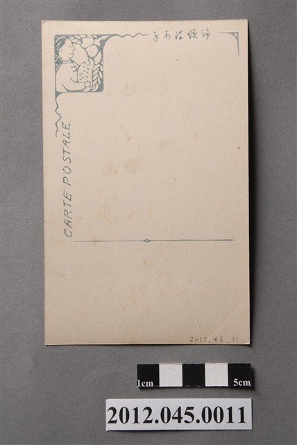 1.本物件為大嵙崁溪(今大漢溪)上游繪圖明信片。正面為河谷繪圖,採直式彩色印刷。圖畫左側和上半部繪製陡峭的河岸山壁,右下半部為河流,河流上有1處沙洲,右下方繪有1名頭戴斗笠的船夫正在划行獨木舟。圖畫左側偏下方處直寫「大嵙崁溪上流」標題,標題下方有「小竹」之繪者署名。右上角蓋有「大正博覽會臺灣館紀念章」,紀念章是由正三角形和倒三角形構成方形,兩三角形間留有空隙,上面的正三角形依序在右邊、頂點、左邊印有「大正博覽會」字樣,中間印「紀」字;下面的倒三角形中間印「念」字,左邊、頂點、右邊依序倒寫「臺灣館」字樣。背面為明信片書寫面,中央偏左處繪製豎線,豎線中央為線包圍的小圓圈;中央上方橫印「CARTE POSTALE」之明信片法文;右上角印有黑色方框,方框內以垂直90度繪製女子圖案;最右側由右而左垂直90度以草書印上「郵便はがき」,為日文明信片之意。2.1914年,日本在東京上野公園舉辦大正博覽會,會場內設置臺灣館,推廣臺灣物產及介紹臺灣原住民。