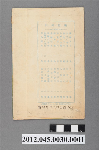 本物件為生蕃屋本店發行的臺中名所系列風景明信片封套。正面為直式彩色印刷,以藍、綠、橙等顏色為底色。中央偏左處有橙色香蕉圖樣,香蕉圖像右下方繪製臺中公園湖心亭圖畫。封面右下處以約45度紅色字體由右上至左下橫寫「臺中名所」4字,4字下方以黃色較小字體橫寫「高級天然色版」字樣。背面以藍色字體刊登「發賣種目」(發行目次),內容包括「臺灣八景 一集」、「文化の臺北 一集」等,共20套、21集,內容遍及西部各大都市,以及日月潭、阿里山等景點,其中「臺中名所」列於第15項。發行種目下方由左而右印刷「出版許可 5.2.28. SEIBANYA」,5.2.28指的是許可發行日期為昭和5年(1930)2月28日;「SEIBANYA」為生蕃屋的日語羅馬拼音。最下方另以黑色印章由右而左印上「臺中樋口兄弟商會發賣」字樣。