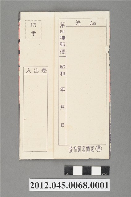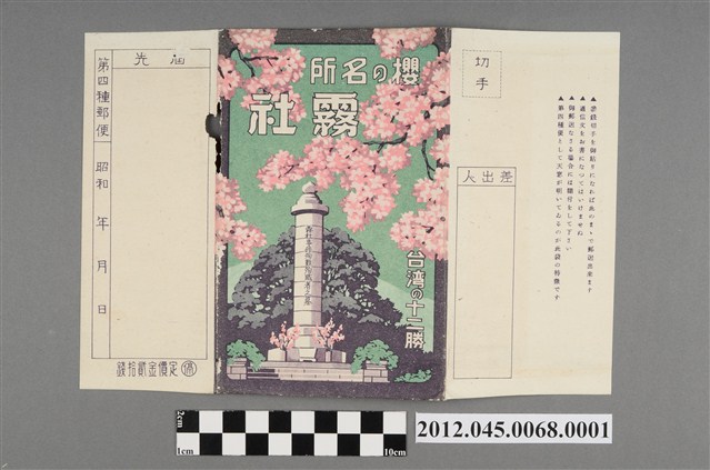 1. 本物件為以櫻之名所霧社為主題之明信片封套,正面為彩色手繪之封面,左右兩側皆有櫻花,左下角有座白色的碑墓,前方插有兩株櫻花,中間有「霧社事件殉難殉職者之墓」,上方標有白字「櫻の名所」、「霧社」,右下角標有「臺湾の十二勝」。封套背面以深藍色印刷,可展開與封面為同一平面,右半部分之右側標有,「參錢切手を御貼りになれぼ此のまゝで郵送出來ます」、「通信文をお書になつはいけませぬ」、「御郵送なさる場合には糊付をして下さい」、「第四種便として天窓が明いてゐのが此袋の特徵です」(大意分別為:將郵票貼在方框內便能進行郵寄、請不要將書信內容寫在此處、若要郵寄請將封袋黏封好、此為第四種郵便設計封套。),右半部分之左側有左上方位置有1虛線方框中印有「切手」為郵票黏貼處,左下方表格標有「差出人」,為填入收信者之欄位;左半部分有1長方形表格,上方「屆先」,意旨此欄填入寄信者,左邊表格文字由上自下為「第四種郵便」(「第四種郵便」指的是當時郵便局分類中,專用於書籍、文件、圖、畫等印刷品與模型、樣品寄送的郵件類別)、「昭和年月日」,欄位下方位置右邊有圓圈,內有1字為「停」,旁有「定價金貳拾錢」。2.埔里盆地自日治初期因位於南北蕃交會點,被認為是理蕃事業適合位置,該地人口組成主要為賽德克族,霧社又為當地一大原住民社。而霧社事件發生於西元1930年,屬原住民武裝抗日事件。霧社事件長達兩個月,發生當日更從臺北州調度應援巡查隊、宜蘭郡與羅東的警部人力,可見規模龐大。霧社神社設立於1932年,名為「霧岡社」,總督府於此神社設立「殉難殉職者紀念碑」,以紀念因霧社事件殉難、殉職的民眾。