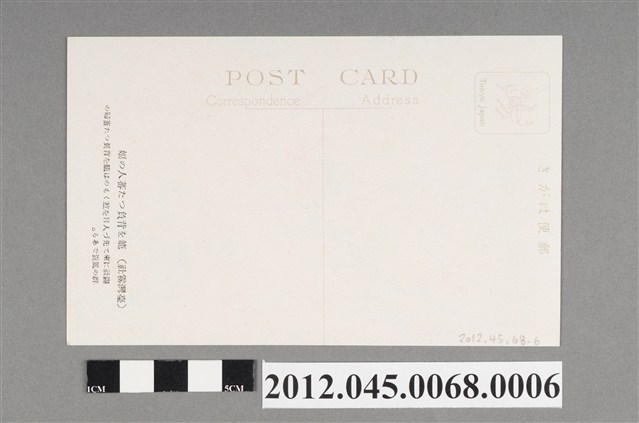 「霧社に來て先づ人目を惹くものは籠を背負つた蕃婦の群の風貌である。」(大意為:抵達霧社後令人注目的是成群背著竹籠的原住民女性樣貌),左方為「POST CARD」,其右方兩側下為「Correspondence」,上為「Address」,中間有1道分隔線。