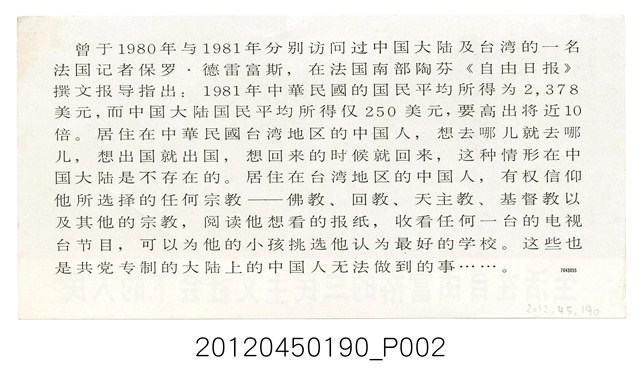 2012.045.0190 「生活在自由富裕的三民主義社會下的人民」中華民國政府對中國大陸政治宣傳單