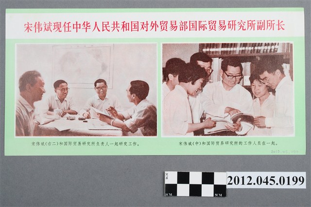 單色簡體字雙面印刷,正面刊登宋偉斌與同事討論畫面照片,背面為他的家人一同研究討論照片。文字敘述指出,宋偉斌是1973年3月到達北京,目前擔任中華人民共和國對外貿易部國際貿易研究所副所長。