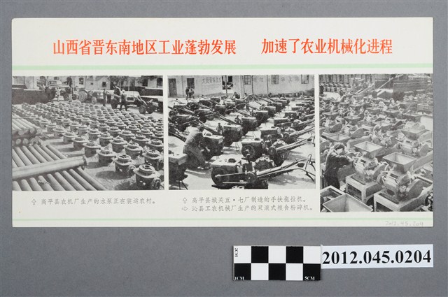 橫式單色雙面簡體字印刷。刊登11屆人大李自成代表率農民在大麥田裡做科學研究,宣稱畝產量超過千斤。背面主題為「山西省晉東南地區工業蓬勃發展、加速了農業機械化進程」,刊登農機生產照片。