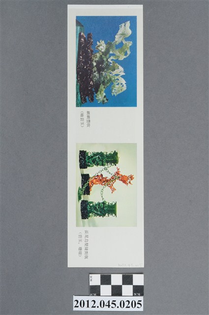 彩色雙面繁體字印刷。正面直式刊登「雙鏈鏤空花籃(碧玉)」照片,背面橫式刊登「網網豐收」、「長尾鳥雙鏈對瓶」玉石作品照片。