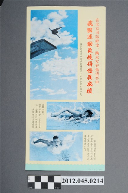 橫式彩色雙面簡體字印刷。文字說明,1975年中國舉辦北京國際游泳、跳水友好邀請賽,中國代表團在該運動會中得到十八項第一名,打破十六項全國紀錄,跳水比賽尤其優異。值得一提的是,1980年之後世界奧委會始正式通過由中國大陸取得中國代表權,在1950年代至70年代三十年間,中國大陸選手未能登上奧運殿堂,1975年舉辦的這場邀請賽,代表中國重返世界體壇的決心,而跳水隊的優異成績,可說是開創中國大陸稱霸世界跳水競技的開始。