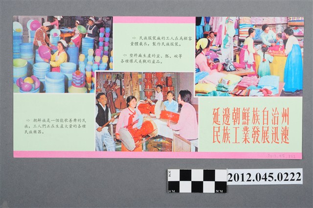 橫式彩色雙面簡體字印刷。延邊為吉林省轄下的自治州,傳單上照片為延邊居民著朝鮮傳統服飾、製鞋、編織、商貿活動等畫面。