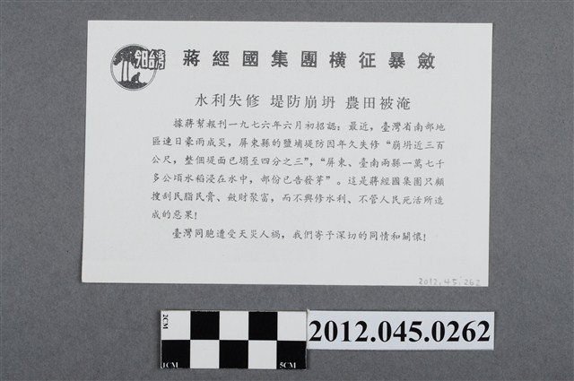 橫式彩色雙面繁體字印刷。正面為大型土木工程--潮陽橋閘照片,短文強調該閘1970擋住颱風,也頂住大海潮的侵襲,背面則是以「蔣經國集團橫徵暴斂」為標題的短文,表示「據蔣幫報刊1976年6月初招認;最近臺灣省南部地區連日豪雨成災,屏東縣的鹽埔堤防因年久失修”崩塌近三百公尺…””屏東、臺南兩縣一萬七千多公頃水稻浸在水中…”這是蔣經國集團只顧搜刮民脂民膏、斂財聚富,而不興建水利,不管人民死活所造成的惡果。」