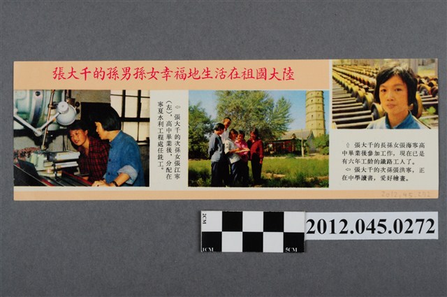 「張大千的孫男孫女幸福地生活在祖國大陸」中國共產黨對臺灣政治宣傳單